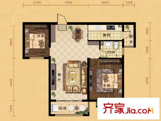 茶博城御府一期高层8号楼B-1户型 2室2厅1卫1厨