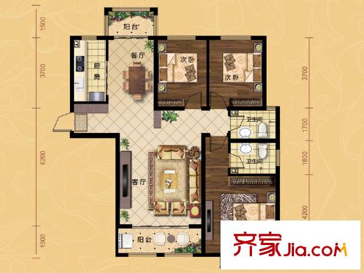 茶博城御府一期高层8号楼A-1户型 3室2厅2卫1厨