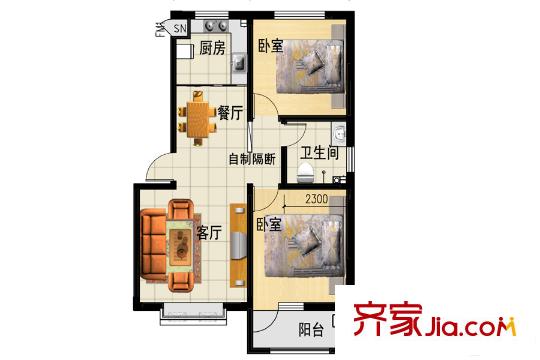 三友鼎盛园多层D2户型 2室2厅1卫1厨