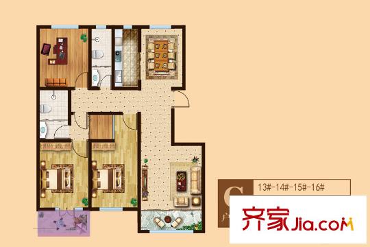 壹品御苑13/14/15/16#楼C3户型 3室2厅2卫1厨
