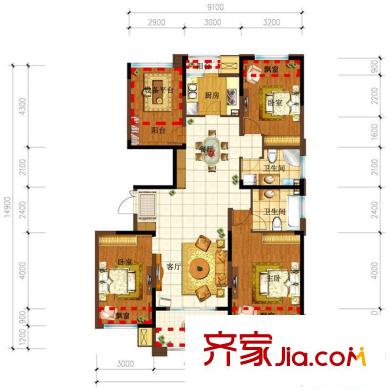 缇香名邸C1户型130平米三房二厅二卫 3室2厅2卫1厨