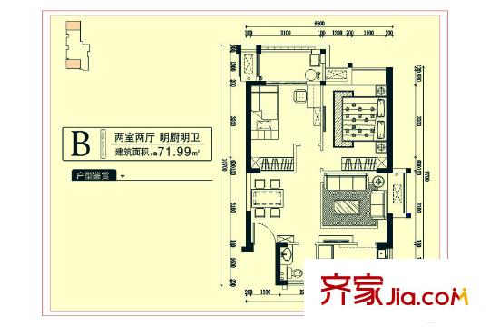 V7星公馆1号楼B户型 2室2厅1卫1厨